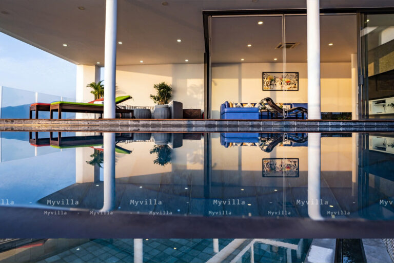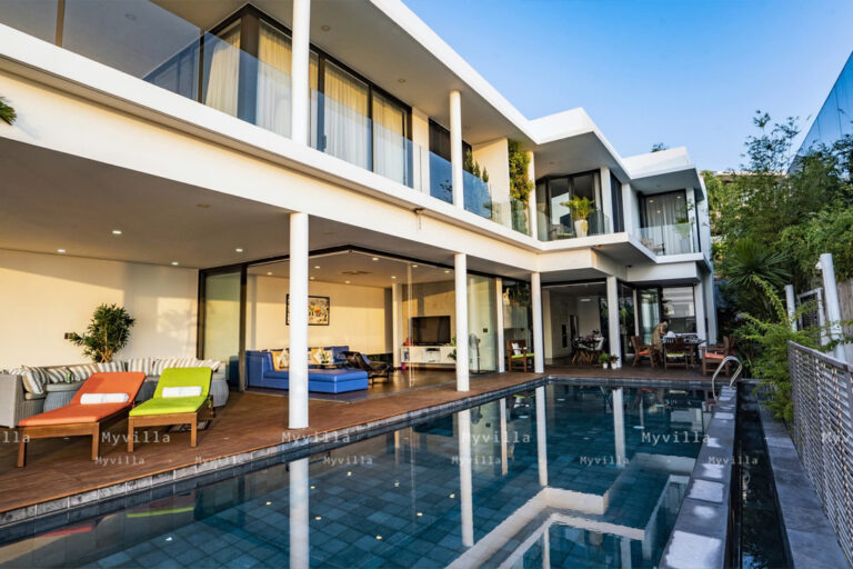 + Khu vực bên ngoài: Hồ bơi vô cực có khu vực tắm nắng, bàn ăn ngoài trời và vườn cây nhỏ.